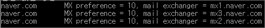 예) 네이버 MX 레코드 확인, nslookup -query=MX naver.com