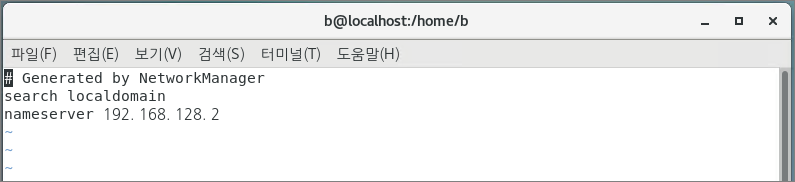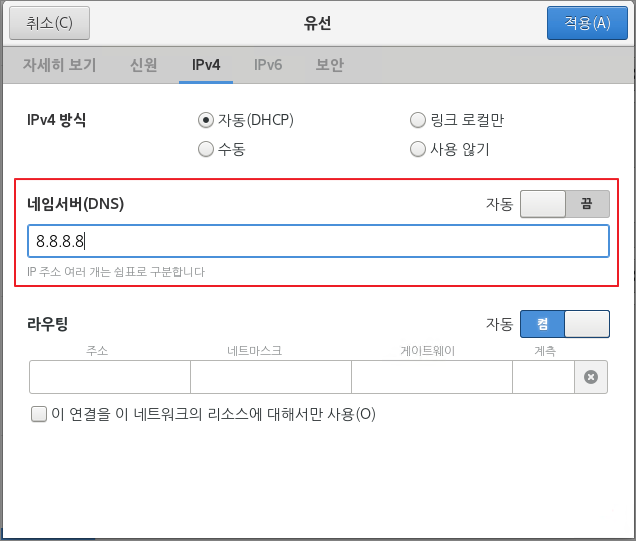 네트워크 매니저를 사용할 경우 위와 같이 네트워크 매니저에 의하여 DNS 주소가 지정됩니다.
