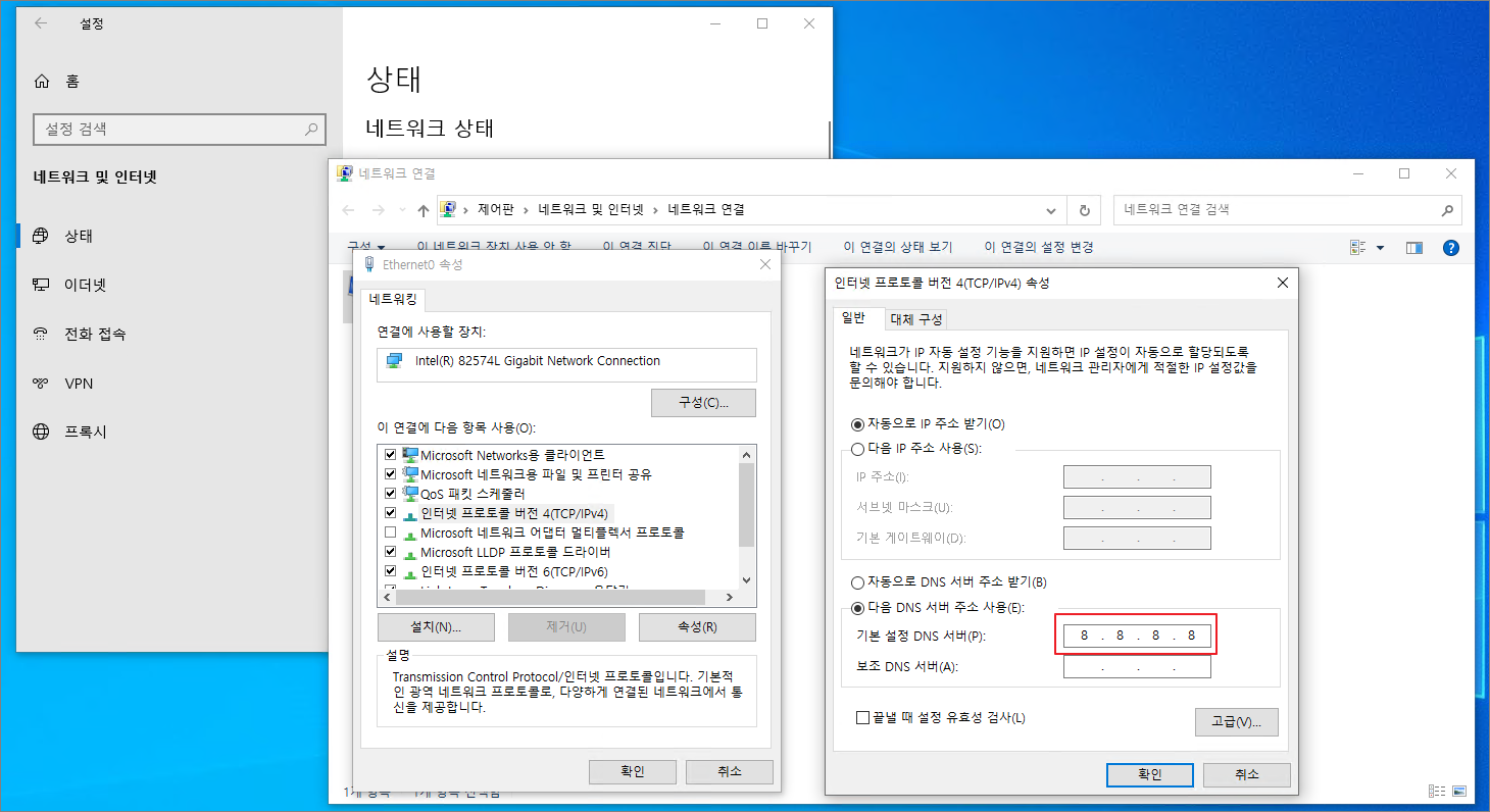 [네트워크 및 인터넷] -> [어댑터 옵션 변경] -> [사용하고 있는 이더넷] -> [속성] -> [인터넷 프로토콜 버전4(TCP/IPv4)] -> 다음 DNS 서버 주소 사용