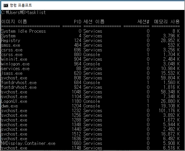 여러가지 명령어가 있지만 tasklist만 입력했을 때는 프로세스명(이미지 이름), PID, 연결 방법(세션 이름), 메모리 등 확인 할 수 있습니다.