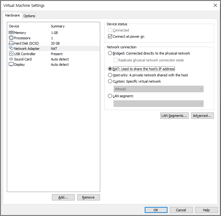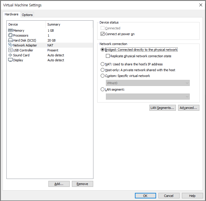 처음 설치하면 '브릿지'로 동작하고 있어 기존 VM들과 동일한 설정(저는 NAT)으로 변경해야 합니다.